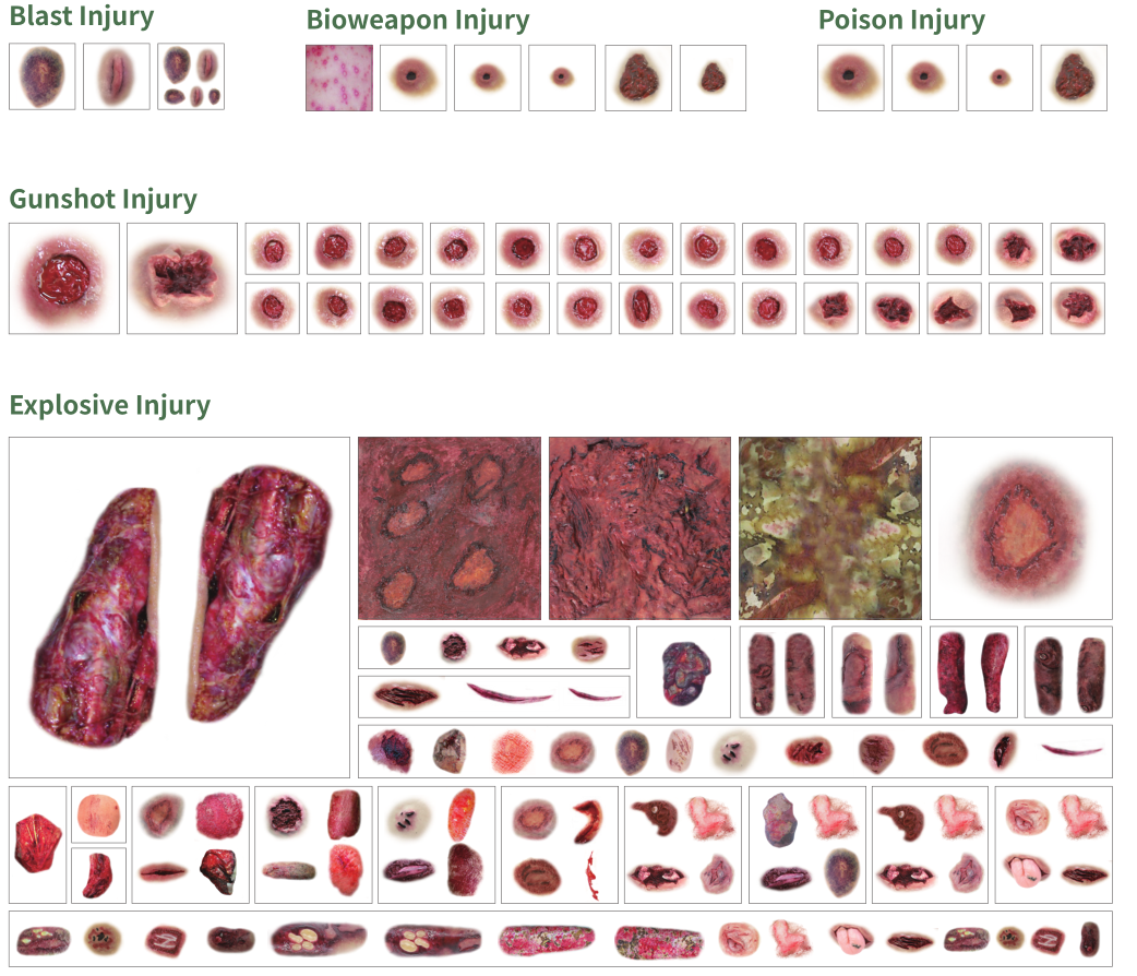 1) Many kinds of injuries such as Explosive Injury, Blade Injury, Ionizing Radiation, Cold Injury, Poison, Crush Injury, Gunshot, Burn, Bioweapon, Bruises, Penetrating Injury, tangential wound, Tubular Wound, Abrasion, Contusion, Laceration, Fracture, etc., including mild, moderate, severe and critical