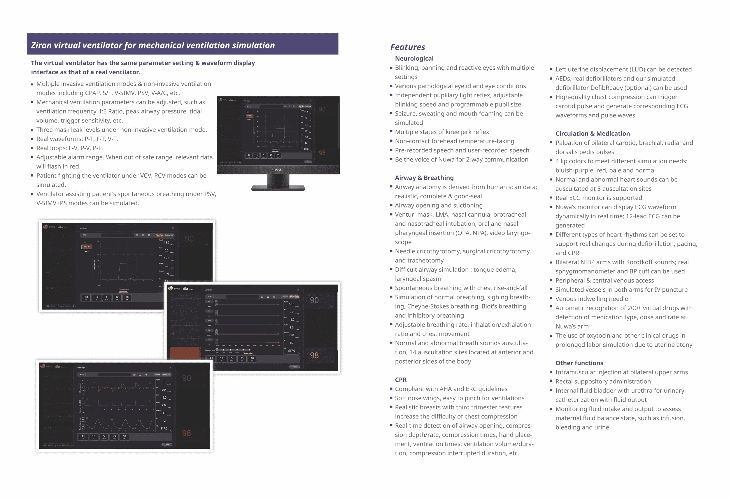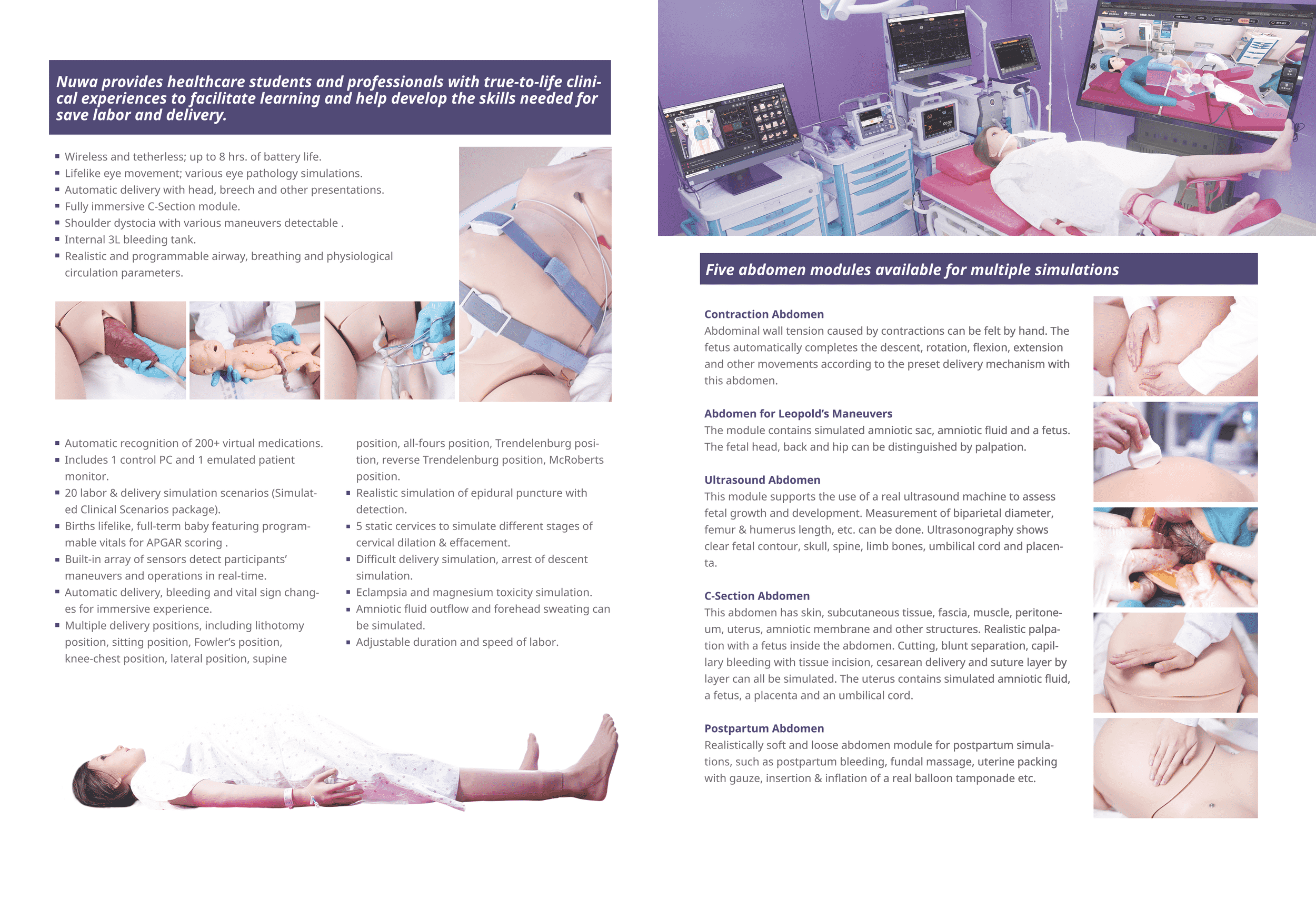 Nuwa-the Birthing Simulator is designed to meet the training needs of obstetricians and midwives. Featured with real-time smart control, automatic delivery, difficult labor and easy operation, it’s for all aspects of childbirth, before, during and after.