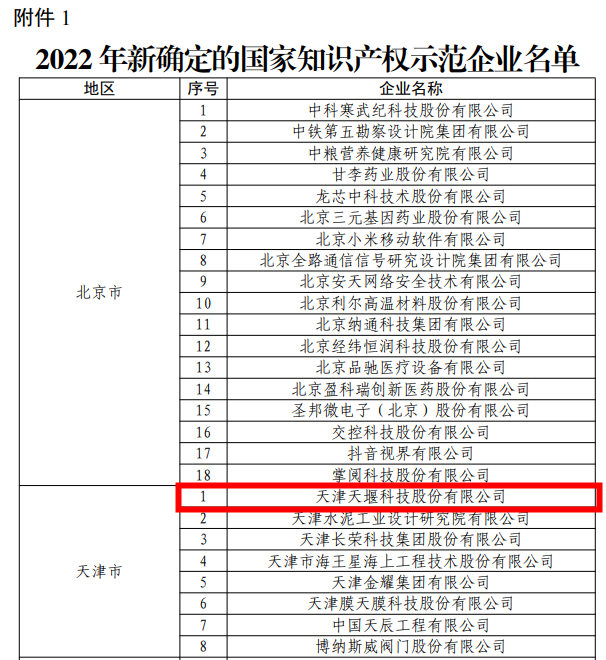 近日,国家知识产权局发布了新一批国家知识产权示范企业和优势企业名单,天津天堰科技股份有限公司成功被评为新一批国家知识产权示范企业,这是自天堰被评为全国企事业知识产权试点单位、全国知识产权优势企业、全国版权示范单位等称号以来,再次获得国家级荣誉。