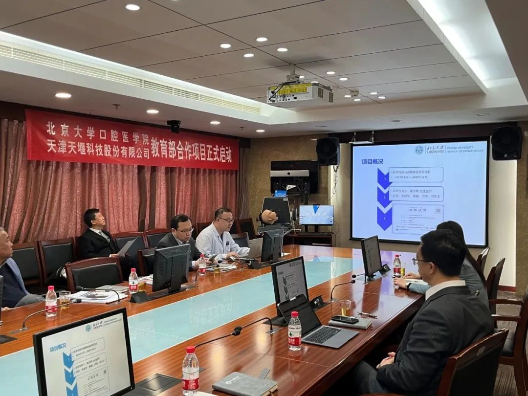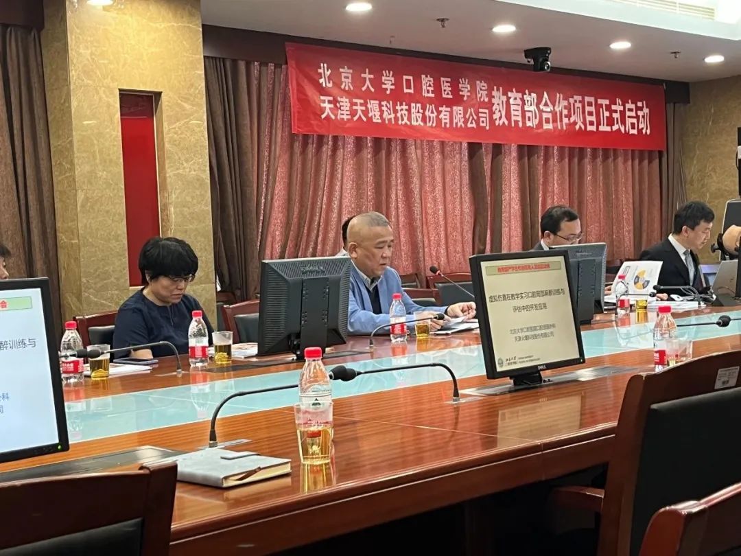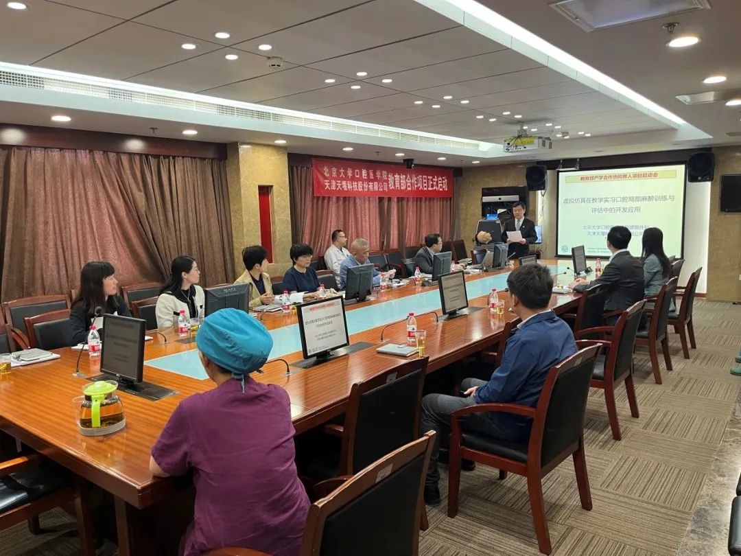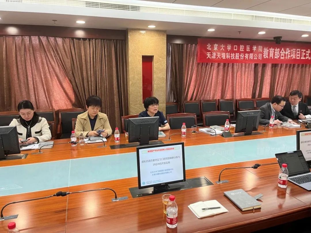 2023年4月24日,在这个春光明媚的日子里,北京大学口腔医院(北大口腔)与天津天堰科技股份有限公司(天堰科技)召开“虚拟仿真在教学实习口腔局部麻醉训练与评估中的开发应用”项目启动会。北大口腔副院长李铁军、中华口腔医学会副秘书长刘宏伟、北大口腔教育处长董美丽、虚拟仿真教研室主任侯建霞、口腔颌面外科副主任贺洋、天堰科技总经理刘雁飞、天堰科技口腔事业部总经理景颖等人出席,在项目总负责人崔念晖主任主持下,双方展开了热烈而有成效的会晤,确定该项目正式启动。