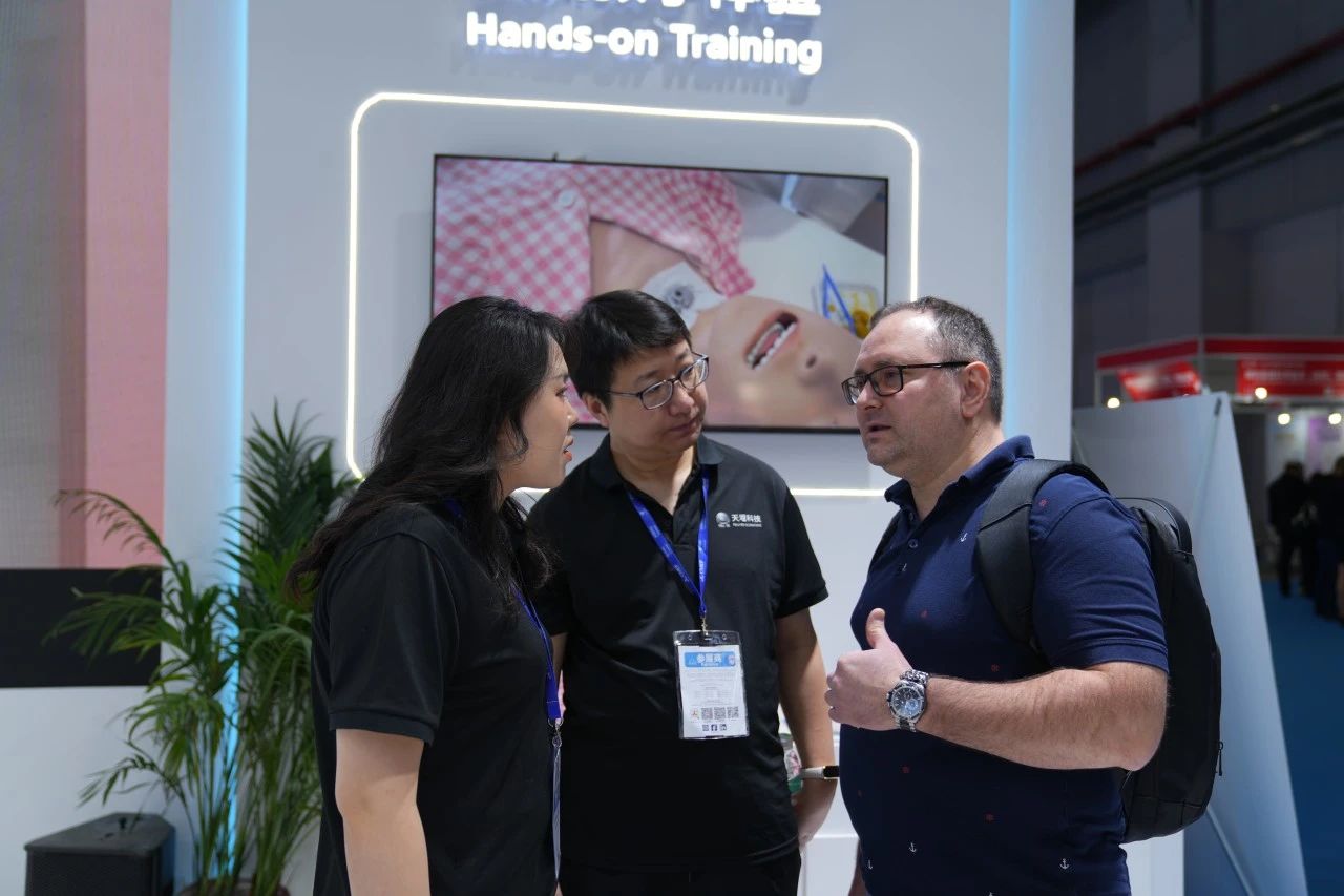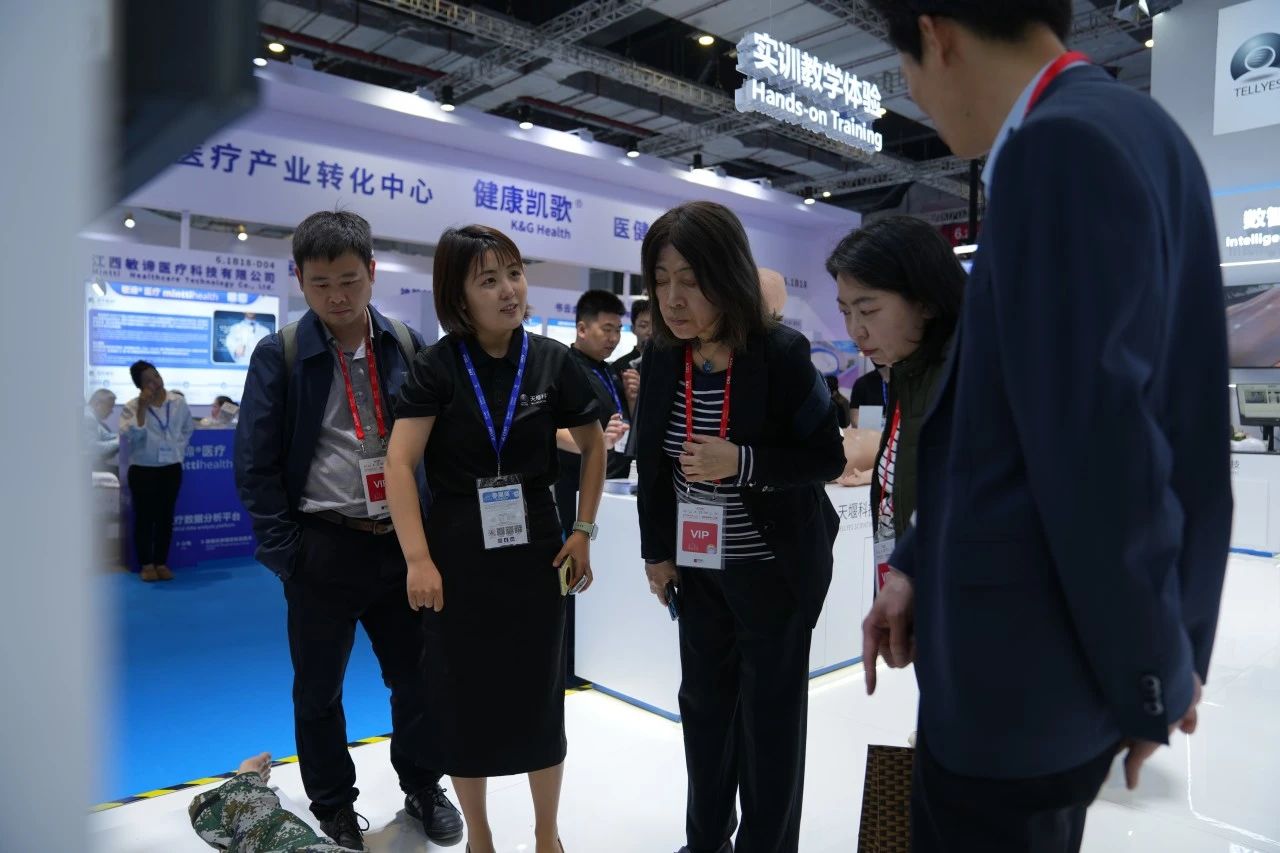 Focused on the Tellyes exhibition area, foreign guests showed great interest in the deep application of AI-based medical education platform and high-fidelity training system. After thoroughly understanding, they all gave consistent praise to the products.