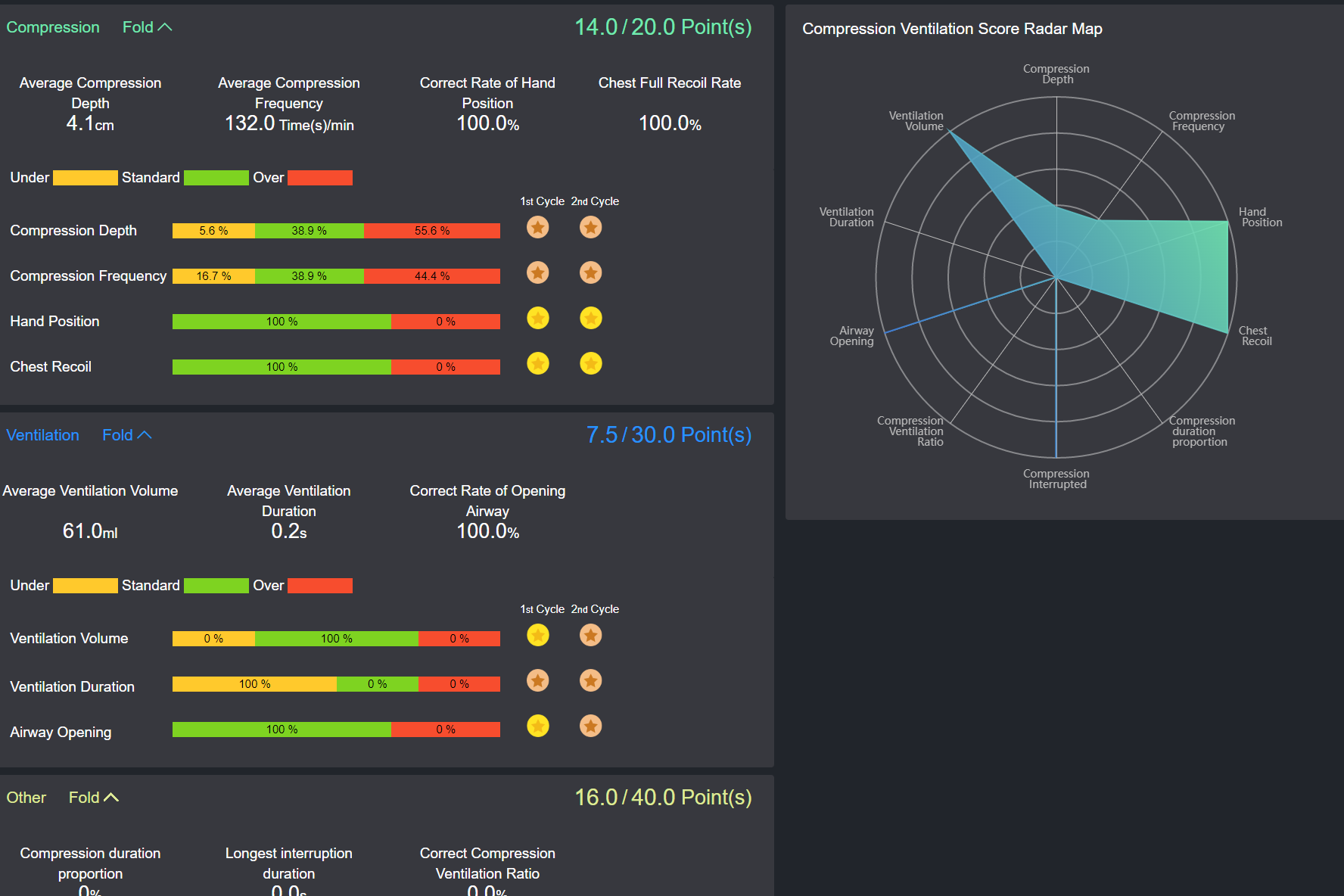 9) Users can view single task training details, including total training score, total duration, number of cycle groups, compression score, average compression depth, average compression frequency, compression position accuracy rate, chest full recoil rate; ventilation score, average ventilation volume, average ventilation duration, airway opening accuracy rate; compression percentage of the entire CPR, maximum interruption time, etc. Scores can be displayed in radar charts. Automatic comments are available for reference.